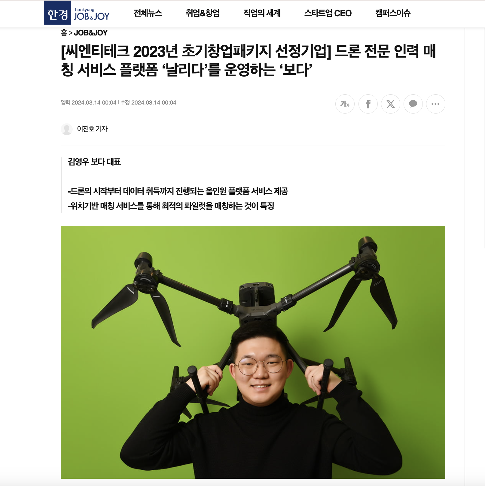 [씨엔티테크 2023년 초기창업패키지 선정기업] 드론 전문 인력 매칭 서비스 플랫폼 '날리다'를 운영하는 '보다'