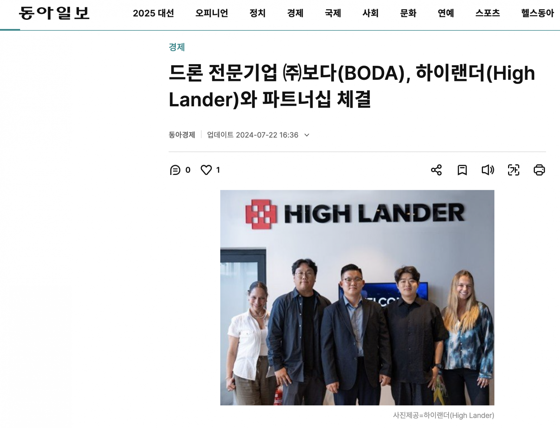 드론 전문기업 ㈜보다(BODA), 하이랜더(High Lander)와 파트너십 체결. 동아일보. 2024-07-22